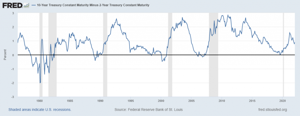 Here is a chart created by the Saint Louis Federal Reserve Bank monitoring the yield curve going back to 1980. The periods in grey are the economic recessions that have taken place.