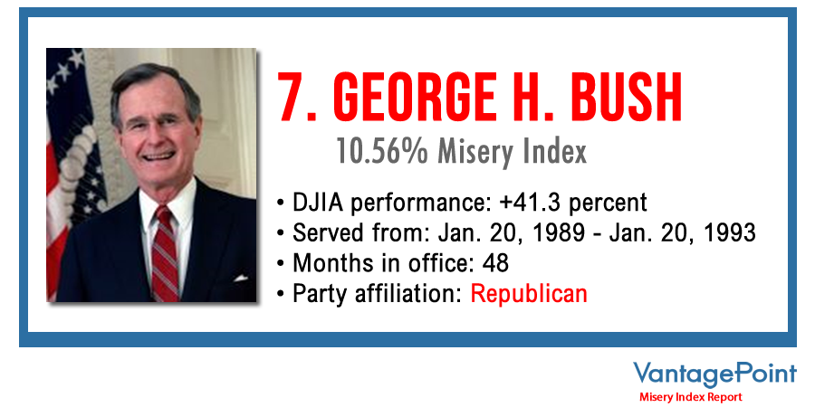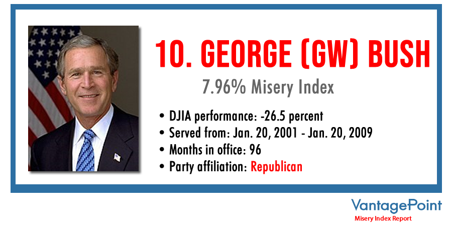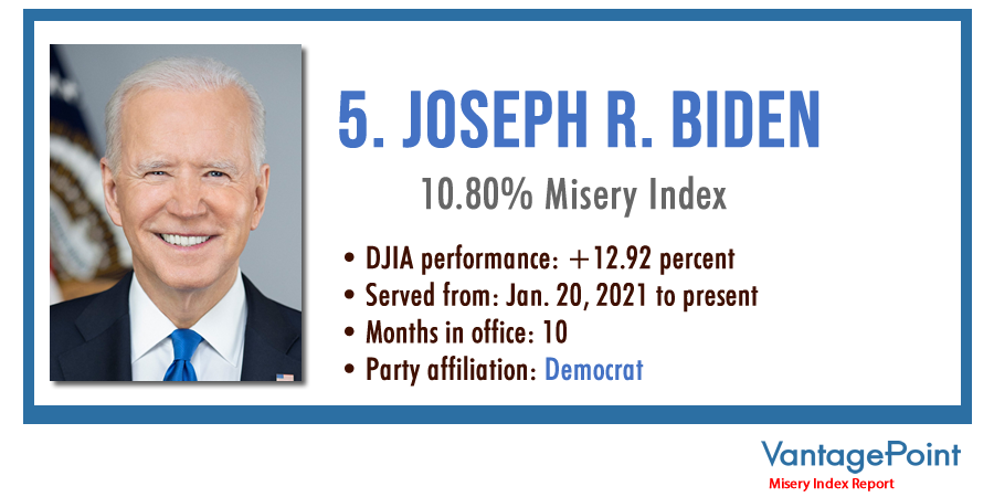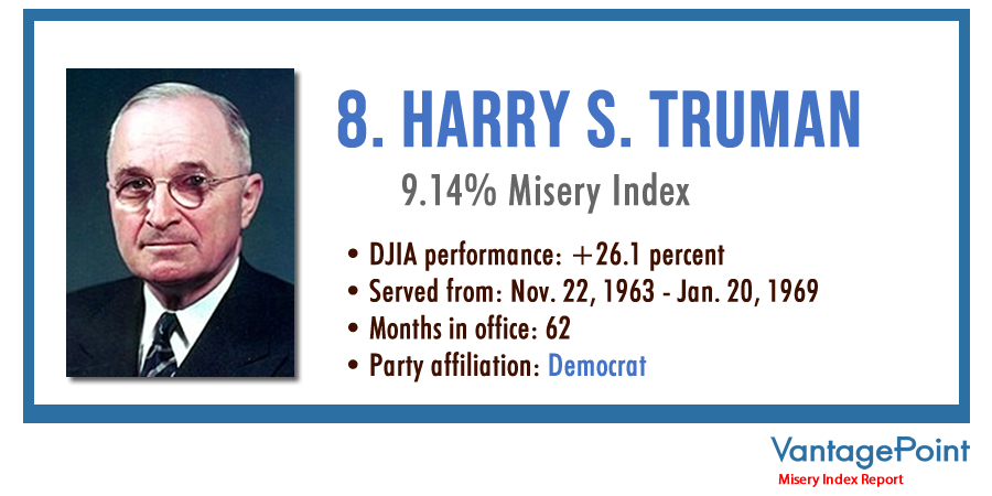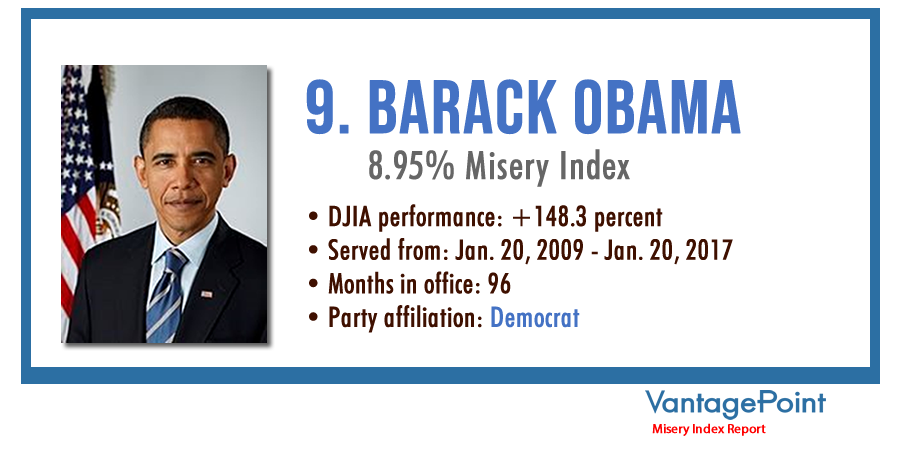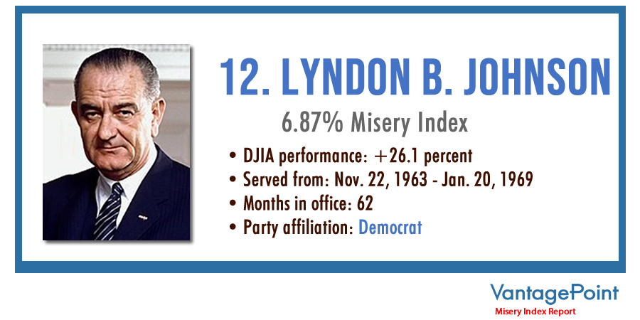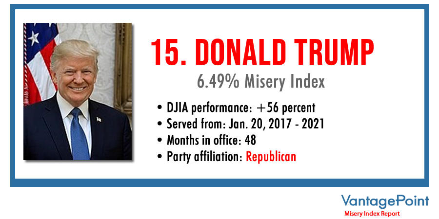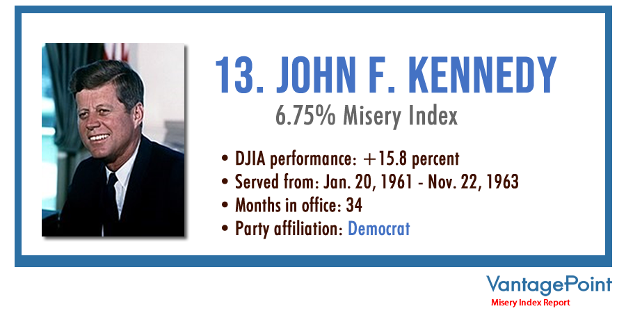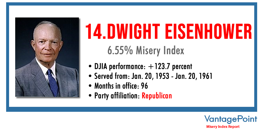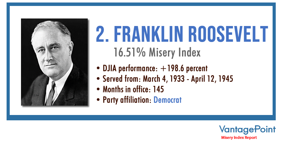 Since Franklin Delano Roosevelt took office at the height of the Great Depression, we have had 15 Presidential administrations in the United States. Here is the ranking of Presidents from lowest Average Misery Index to Highest Average Misery Index over the last 88 years, accompanied by the performance of the Dow Jones Industrials during their term in office.