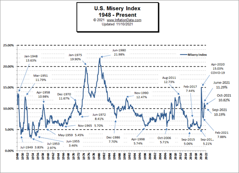 Currently, in the United States the Misery Index is at 10.8 percent. During the lockdowns and beginning of the pandemic the Misery Index temporarily hit a high of 15.13%.