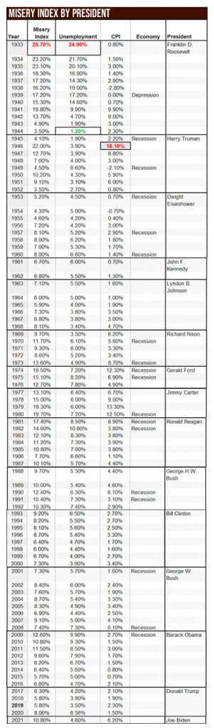 Below is all the data that I used to make these calculations presented on a simple spreadsheet which shows the Misery Index for every year going back to 1933. You can quickly see that FDR had the highest all time Misery Index value at 25.79% and Harry Truman had the lowest Misery Index reading at 3.5%. What is noteworthy and of concern to me is that the Biden Presidency after only 10 months is in the #5 position for the Misery Index out of 15 Presidents.