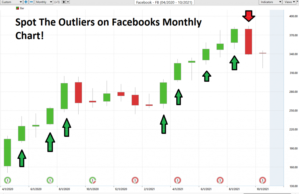 Here is Facebook. The first outlier occurred when Facebook was trading at $226. It has traded as high as $383 and is currently at $341. All we are doing is looking for markers on the monthly chart where the stock was trading above the previous high or below the previous low.