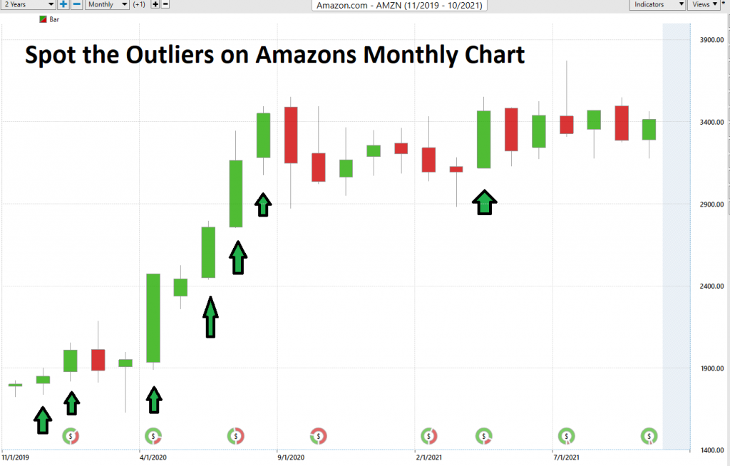 Here is Amazon. Over the last two years it has closed above its previous months high 6 times. The first outlier pattern occurred when Amazon was trading at $2013. Today it is trading at $3420.