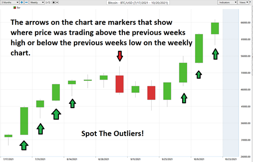 Here is Bitcoin on the weekly charts. Bitcoin was trading at $34,000 at the beginning of this chart and now it is trading at $66,000. Look at how many times the weekly outlier pattern occurred and how the trend continued to follow suit.