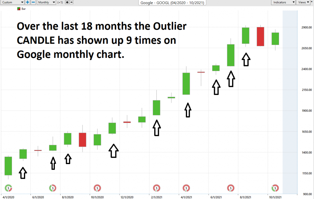 Over the last 18 months, the OUTLIER candle has shown up 9 times on the Google Monthly chart. The first outlier candle occurred at $1445. Google is currently trading at $2830.