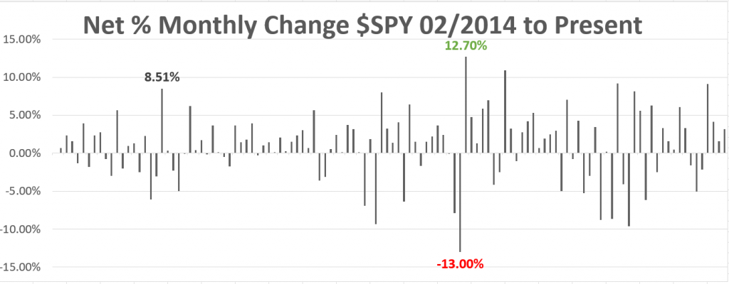 The graphic below is the monthly performance metrics of the $SPY over the last 10 years. The data is presented as the net change from each month’s closing price to the following month’s closing price.