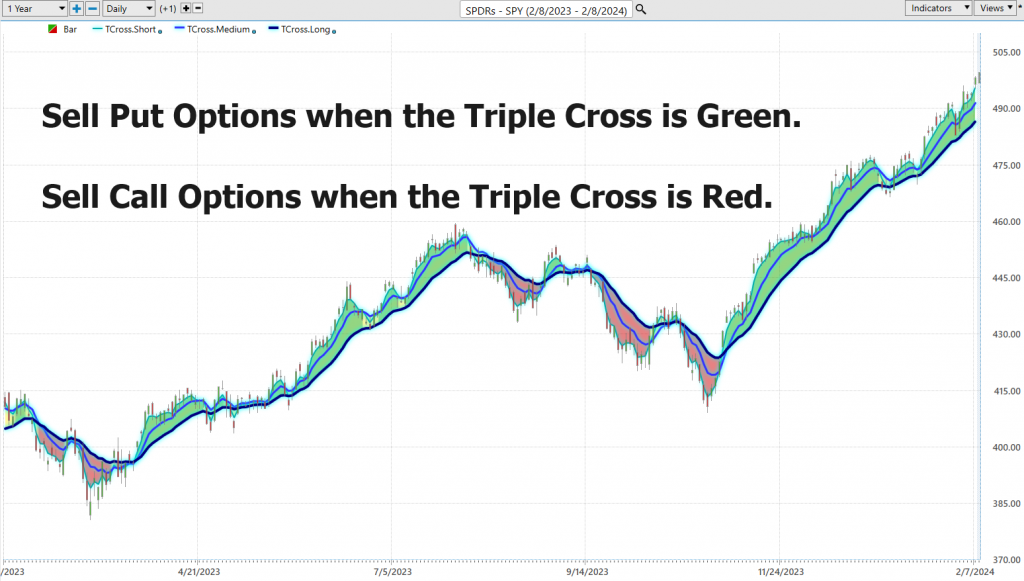 Study the following chart of the VantagePoint A.I. Triple cross indicator which we use regularly in our weekly stock studies. When the indicator turns green it indicates that the 3 predictive moving averages all are confirming and uptrend. When the indicators turns red the indicators confirm a downtrend.