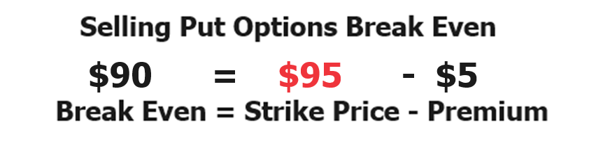 The put option seller will begin losing money at expiration at any price below $90 per share. This is because they obligated themselves to purchase the underlying stock at $95 per share but received a premium of $5 to create that obligation. The billion-dollar question that the put option seller asks is what is the probability of the stock falling below $90 at expiration? At any price above $90 at expiration the put option seller will still be profitable.