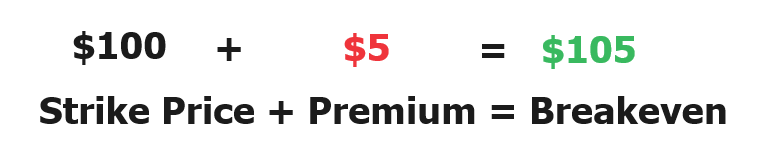 Here is the simple commonsense math that every option trader does whenever they purchase a call option: If the strike price is $100, we need to add the premium of $5 to determine the breakeven price at expiration.