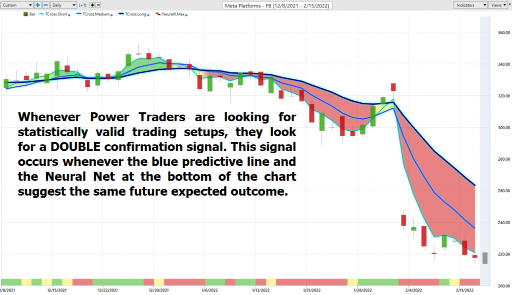 Whenever Power Traders are looking for statistically valid trading setups, they look for a DOUBLE confirmation signal. This signal occurs whenever the blue predictive line and the Neural Net at the bottom of the chart suggest the same future expected outcome.