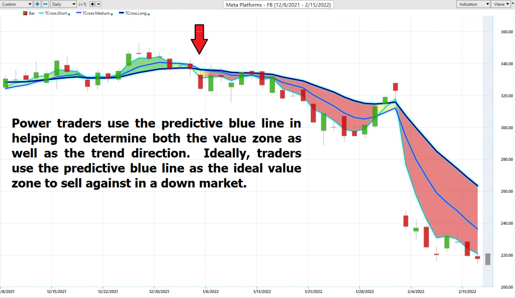 Power Traders pay close attention to the relationship between where price closes in relation to the slope of the predictive blue line. between the black line and predictive blue line. On January 5, 2022, $FB closed below the predictive blue line signaling a DOWN forecast at a price of $324.71.