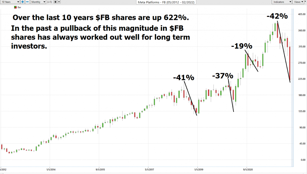 Here is a snapshot of the drawdowns that $FB has experienced over the past decade measured on a percentage basis. In the past decade any time that $FB shares were selling 30% or greater below its most recent high presented a great buying opportunity for longer term investors.