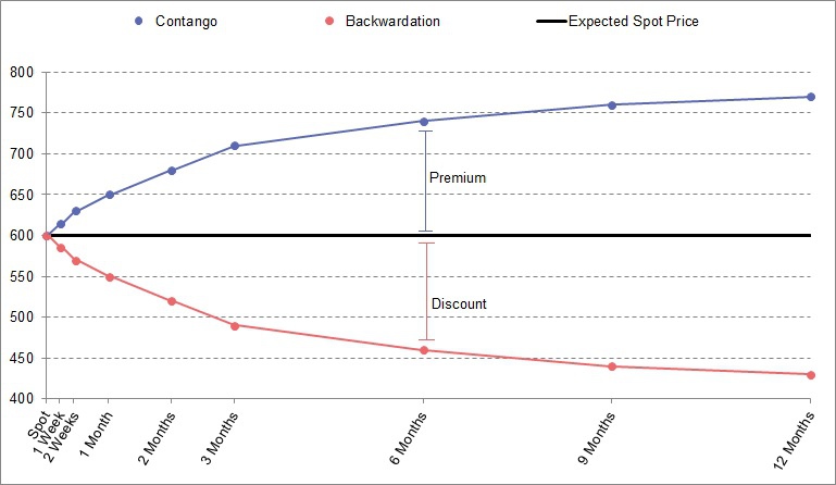 When the future price is higher than the current spot price, the market is considered to be in “contango.” This simply means that market participants and pricing mechanisms all think that over time, in the future, the price will be higher than it is currently. If you were to draw a graph of this condition it would look like a forward sloping curve. Traders sometimes monitor this by simply looking at the spread, which is the difference in prices between the forward month and the distant months. When the distant months trade at a premium to the current month, a “contango” exists.