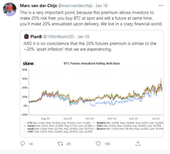Here is a twitter post from January 18th from two prominent bitcoiners discussing the 20% arb yield on bitcoin.