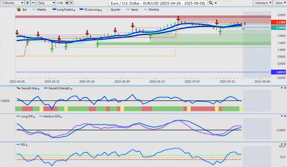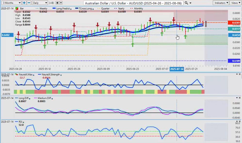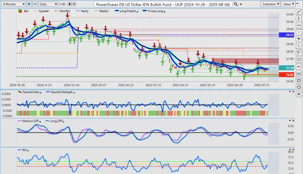 Now, what I’ve pointed out in the last few outlooks is that it is the fiscal fourth quarter for the U.S., and in most cases, there’s demand for U.S. dollars. So, looking at the indicators in VP, the dollar is starting to turn bullish again. Now, there’s a lot of factors that could send the dollar lower: the trade tariffs, Trump’s war with Powell. We also have the event risk this week of the Federal Reserve interest rate announcement. What you really want to watch with that is the press conference to see what Powell’s plan is going forward.