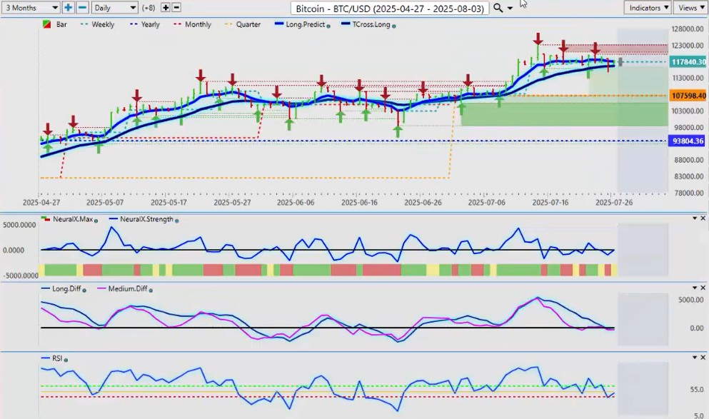 Now, Bitcoin again — having a pretty strong quarter here — but we’re losing momentum, guys. The medium- and long-term predicted difference are pointing down. But here’s a very interesting way to look at the predicted RSI. I’m looking for a break of the 40 level to get shorts moving here. I believe we will retest 107598 before Bitcoin makes its final run-up for the calendar year.