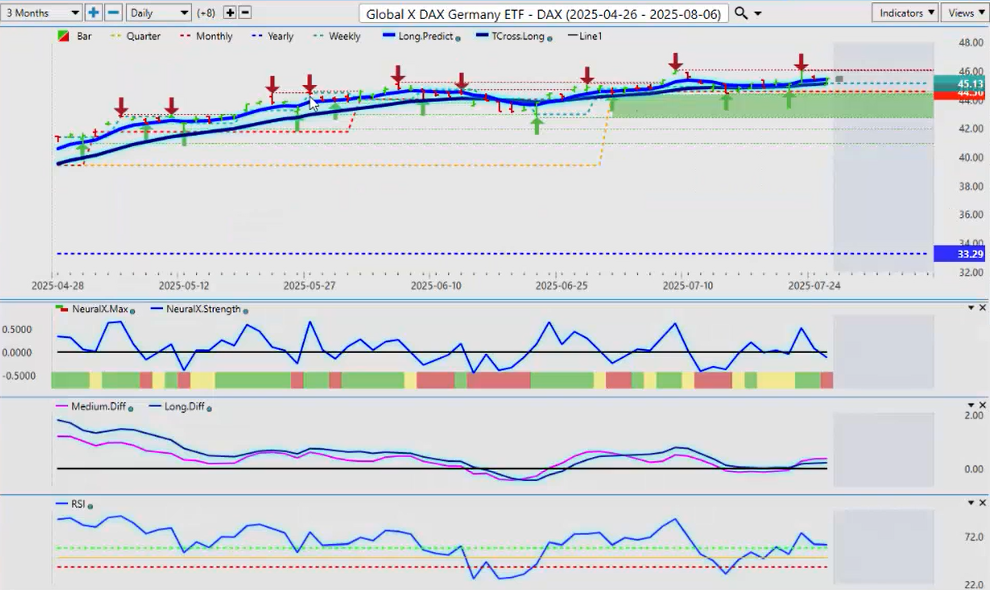So again, the same thing: If you believe the DAX is done, then you put a sell stop order just below the quarterly opening at 4456. If it triggers and breaks, then we have a pretty decent retracement area down into the 3329 area.