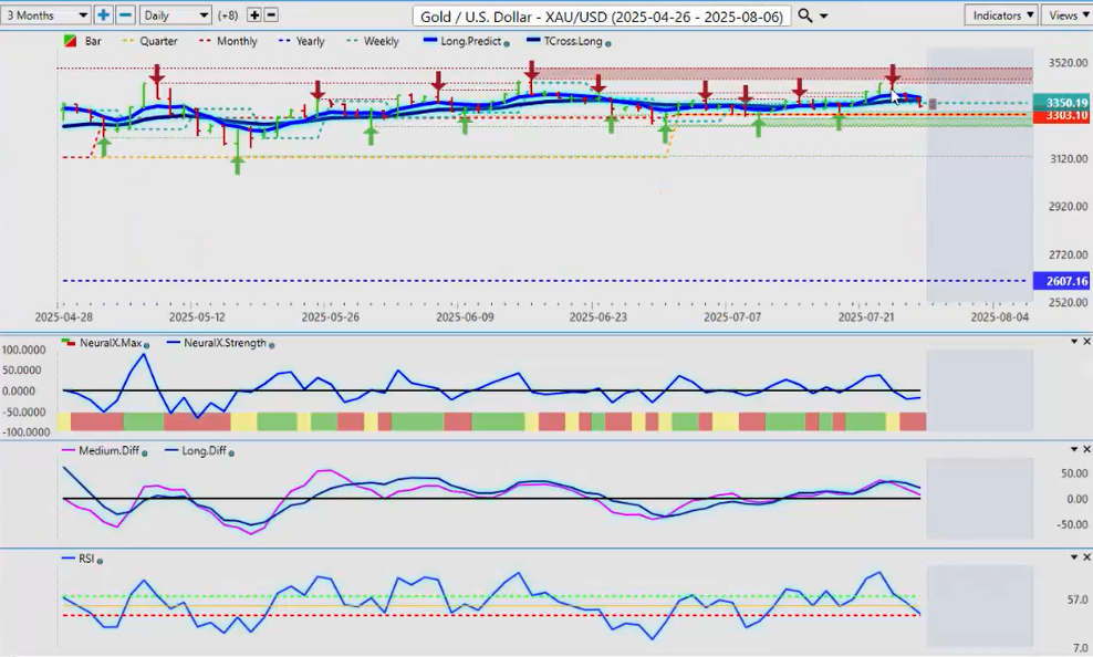 Now, when we do that comparative to gold, we can see that gold also is holding above its quarterly opening price, but it’s not carrying the same bullish tone as the U.S. dollar. We have the MA diff cross that has taken place right here. That’s warning that at the very minimum, we are likely to come down and test that quarterly opening at 3303. In my respectful opinion only, I think that it will likely break if we can get dollar strength. But either way, we are likely to see dollar strength in mid-August into the end of September.
