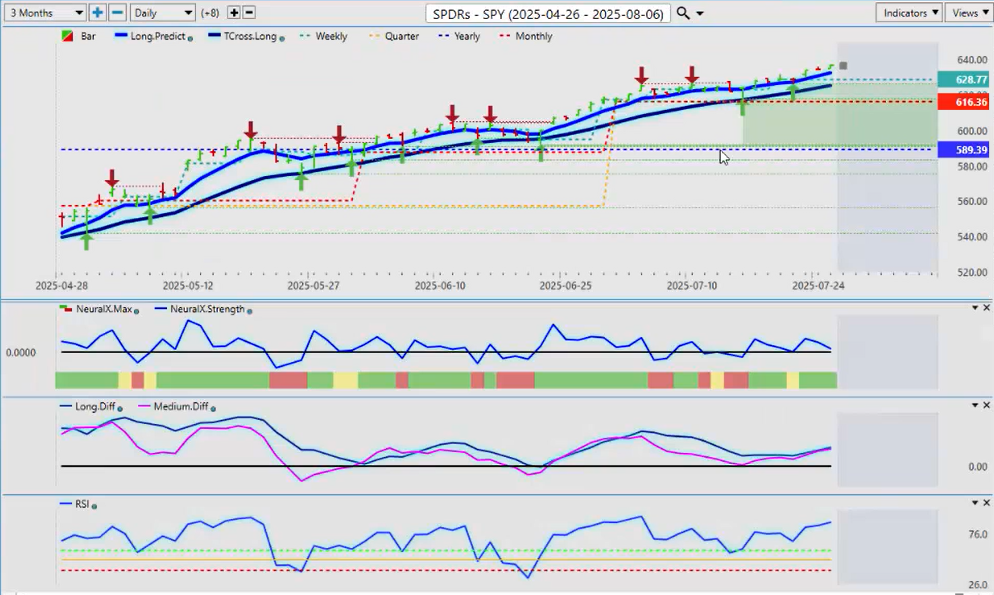 Now, the SPYs have done very well again. They’re starting off the quarter bullish yet again with the dollar. We’ve had one major retracement on July the 16th, directly on the TCROSS long and the quarterly opening price at that time — 61636. That is our key support level. The indicators in VP are a little bit mixed. I would argue we’re a little bit overextended, but I could also say we were overextended months, if not years ago — and it still continues to climb higher.