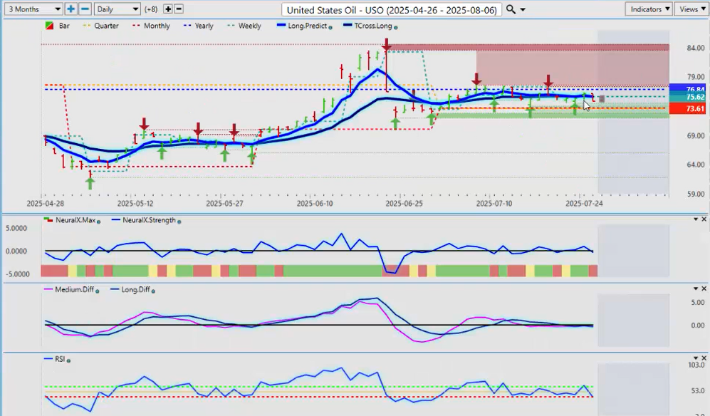 Here’s an alternative way to invest or trade in this, guys: If you put a buy stop order above 76.84 and a sell stop below 73.61, that is probably the best way to play this and wait for this break to occur. But in my respectful opinion only, these indicators are suggesting that that break is going to be lower, not higher. So keep that in mind, but be mindful of those particular areas.