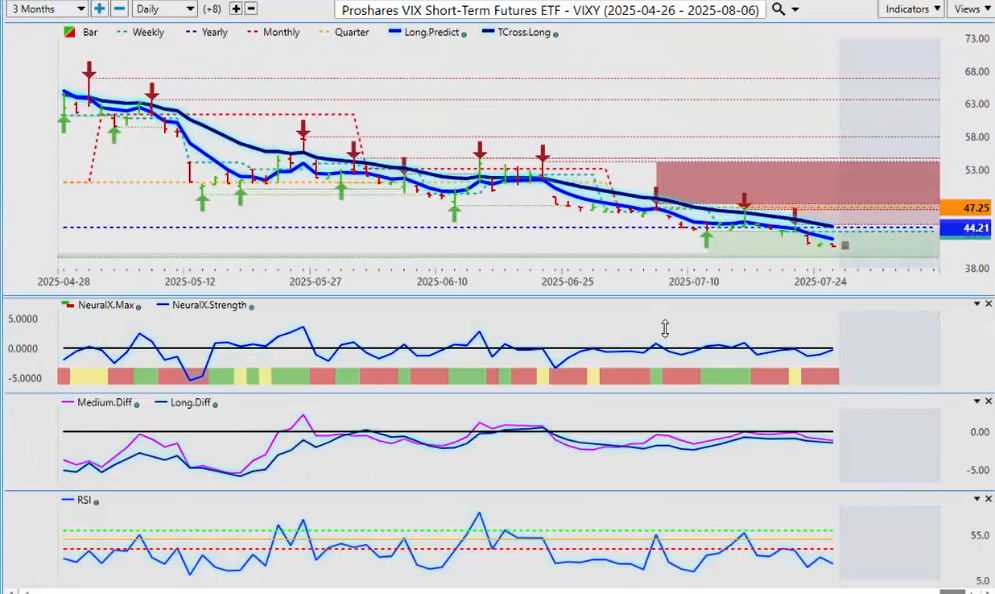 And of course, we want to look at the VIX. What is the volatility? Well, we’re breaking down below the calendar yearly opening price. And again, the quarterly opening is now in position — 47.25. Our main resistance area on the VIX — the VIXY, excuse me — and we’ve got our Tcross long — 44.35. So we know exactly where our resistance is.
