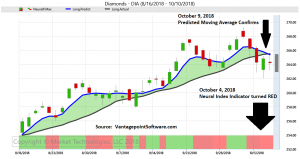 Lane Mendelsohn: This is a chart from the artificial intelligence software and what you see down below is on October 4 this indicator went from green to red, clearly indicating weakness. And the Dow did start dropping about four days ago. So that nailed the prediction in terms of the weakness that was starting to set in. But last night we had a crossover right there. So that was confirmed. So when you have this indicator go red and the indicator up above cross over, that’s a double confirmation, clear-cut indication that the Dow was going to go down today.