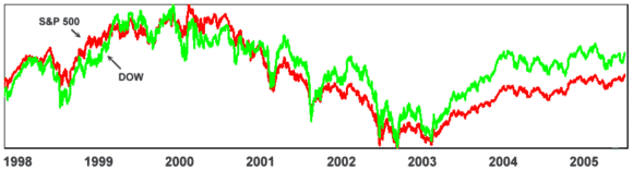 Figure 1: Relationship between two single markets is obvious here, showing the highly correlated Dow Industrial Average (DJIA) and S&P500 (SP) from 1998 through 2005.