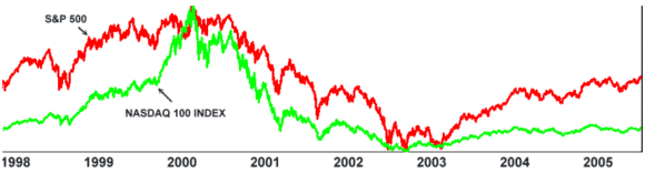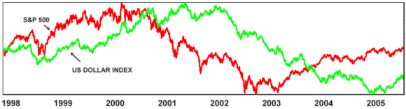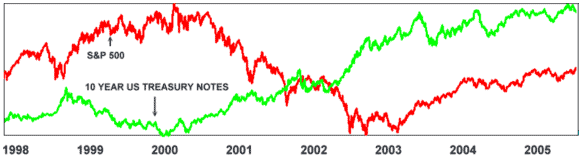 Figure 2: This chart shows the relationship between different asset classes, stocks (S&P500) and bonds (10-Year Treasury Notes) from 1998 to 2005. As John Murphy has noted, bonds and stocks decoupled and began moving in opposite directions in 1998 due to the deflation threat that arose in the wake of the 1997 Asian currency crisis. The two asset classes recoupled, moving in the same direction again once the deflation threat ended in late 2003.