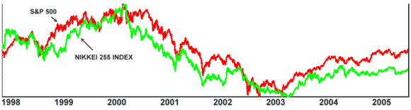 Figure 4: Here we see two indexes in different countries affecting one another, the S&P500 and Nikkei 255.