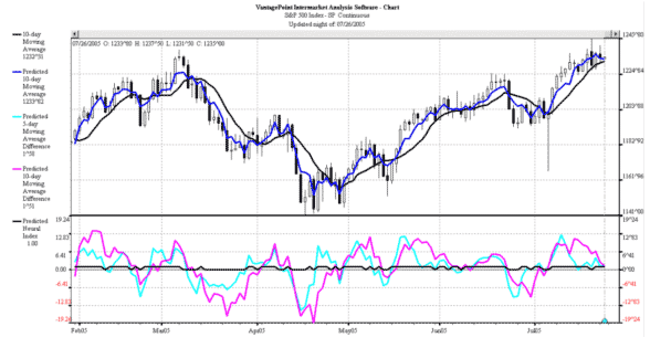 Most traders know how to read a moving average crossover and oscillator. When the shorter-period moving average crosses above the longer-period one, it’s a buy. When it crosses below, it’s a sell or exit. When an oscillator (lower subgraph figure 6) reaches an upper extreme, it signals an overbought condition. At lowest extremes, the security or issue is oversold. Divergence, a powerful signal generated by oscillators, works equally well in the case of the Predicted five-day and 10-day moving average differences in the lower subgraph.